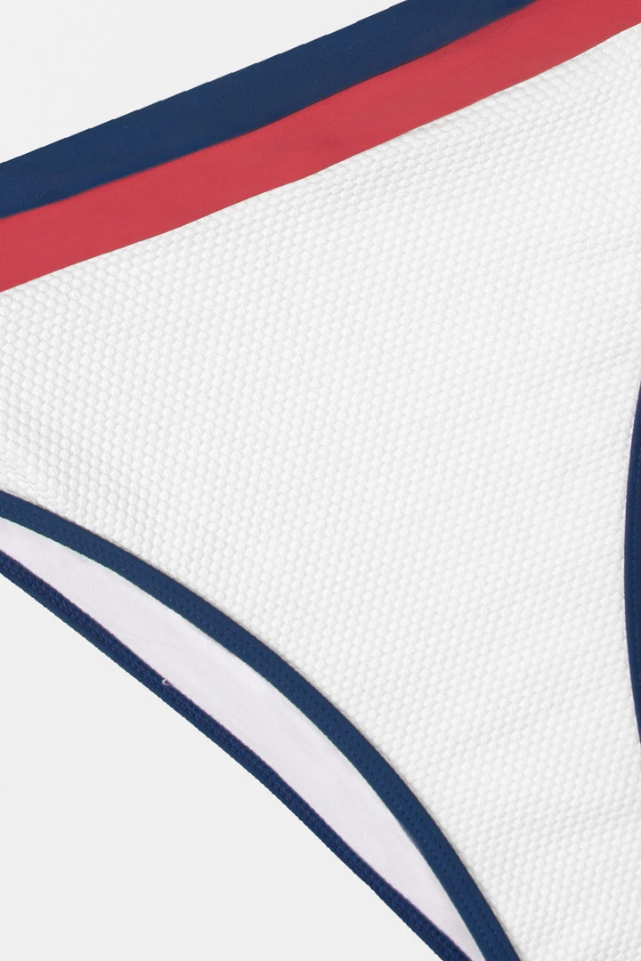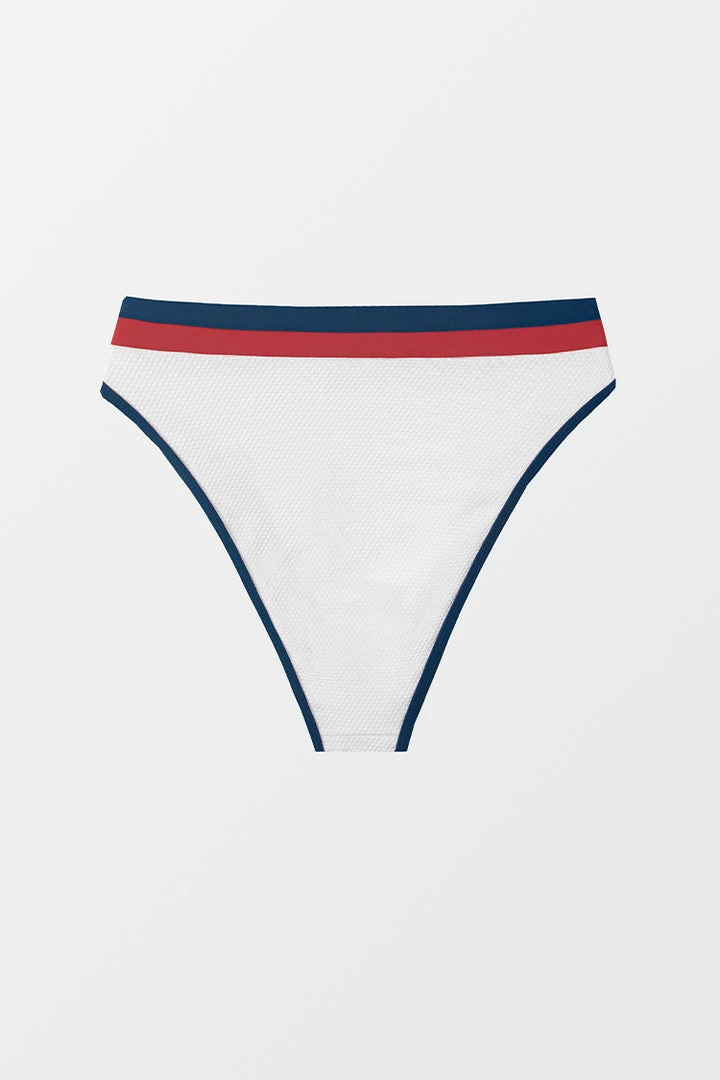 Get ready for the summer in this pair of bikini bottoms featuring a pique design, banded high-rise waist, colorblock construction, and a cheek-leg cut, and modern bum coverage.