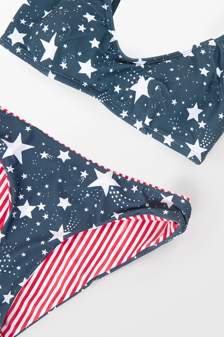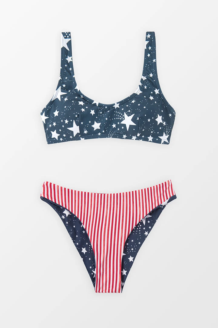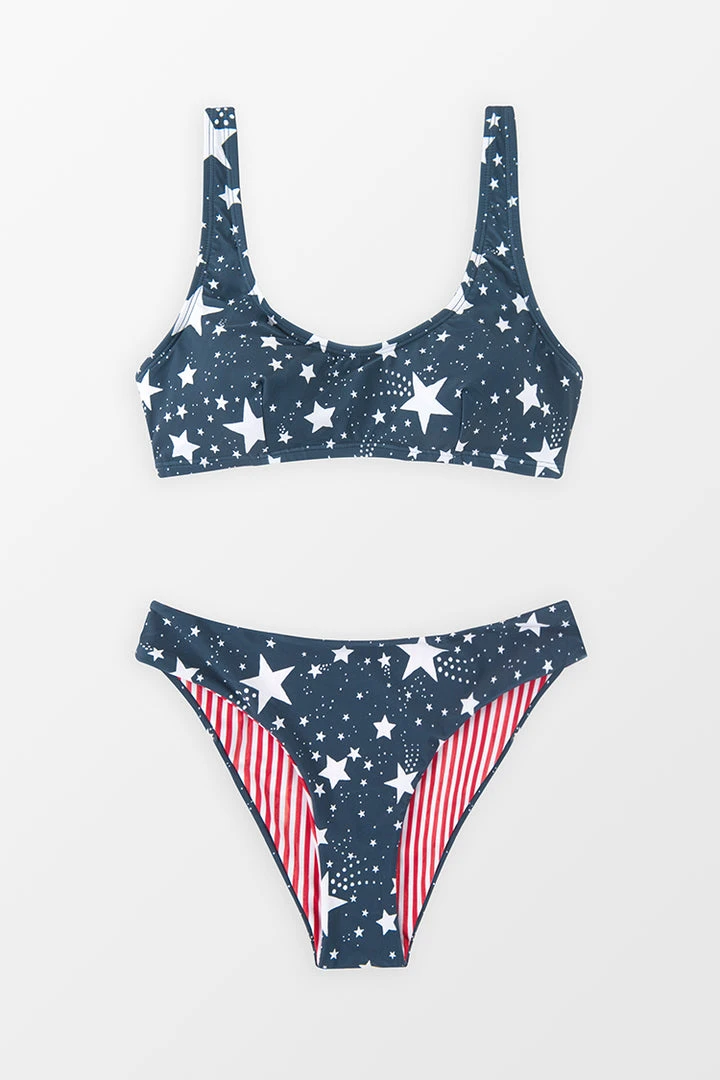We are totally feeling this patriotic bikini set for the Fourth of July babe! Featuring a bralette with an allover star print, scoop neck, and shoulder straps, as well as a pair of reversible bottoms with a star and striped pattern, extra cheeky bum coverage, and a high-leg cut.