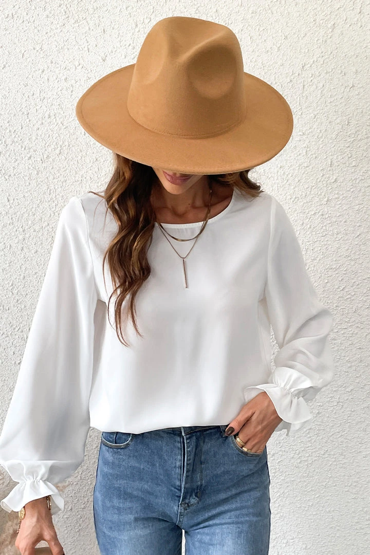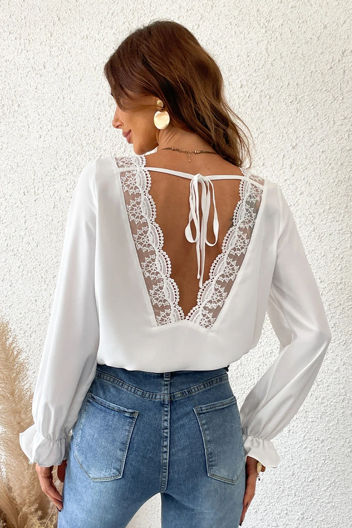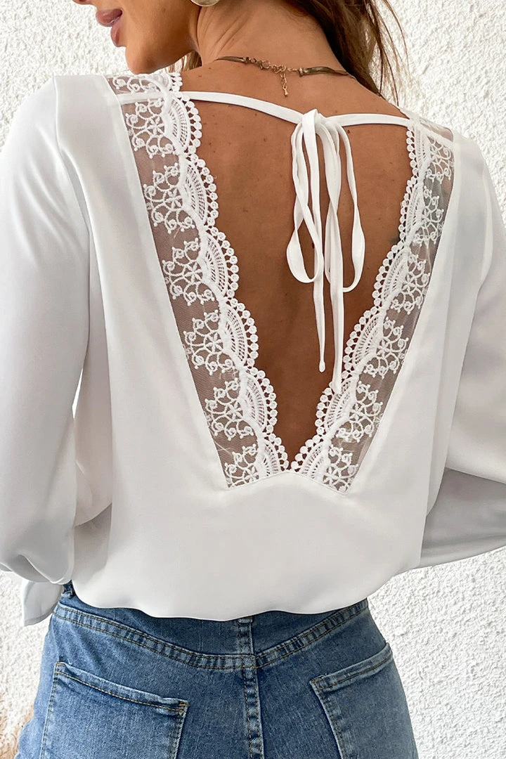 Add some shine to your wardrobe. This Long Sleeve Lace Trims Backless Tops features a scoop neckline and long sleeves. Pair with relaxed trousers for an effortless yet put-together look.