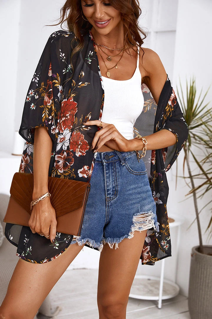Be poolside chic in our Normal Sleeve Print Pattern Chiffon Kimono Cover Up. Features black floral print fabric with normal kimono sleeves. Wear with all your favorite swimwear and sunnies for an easy put together pool look.