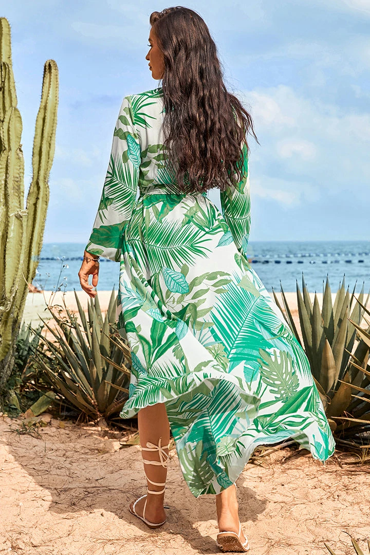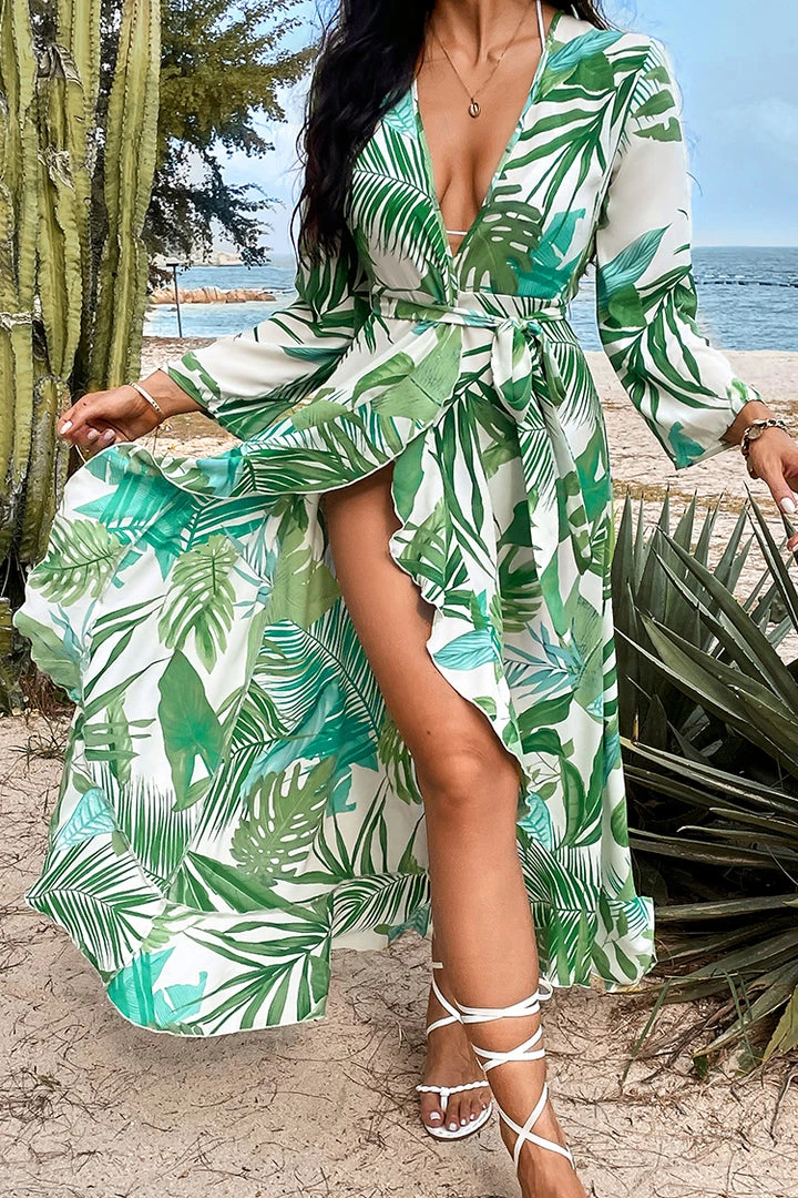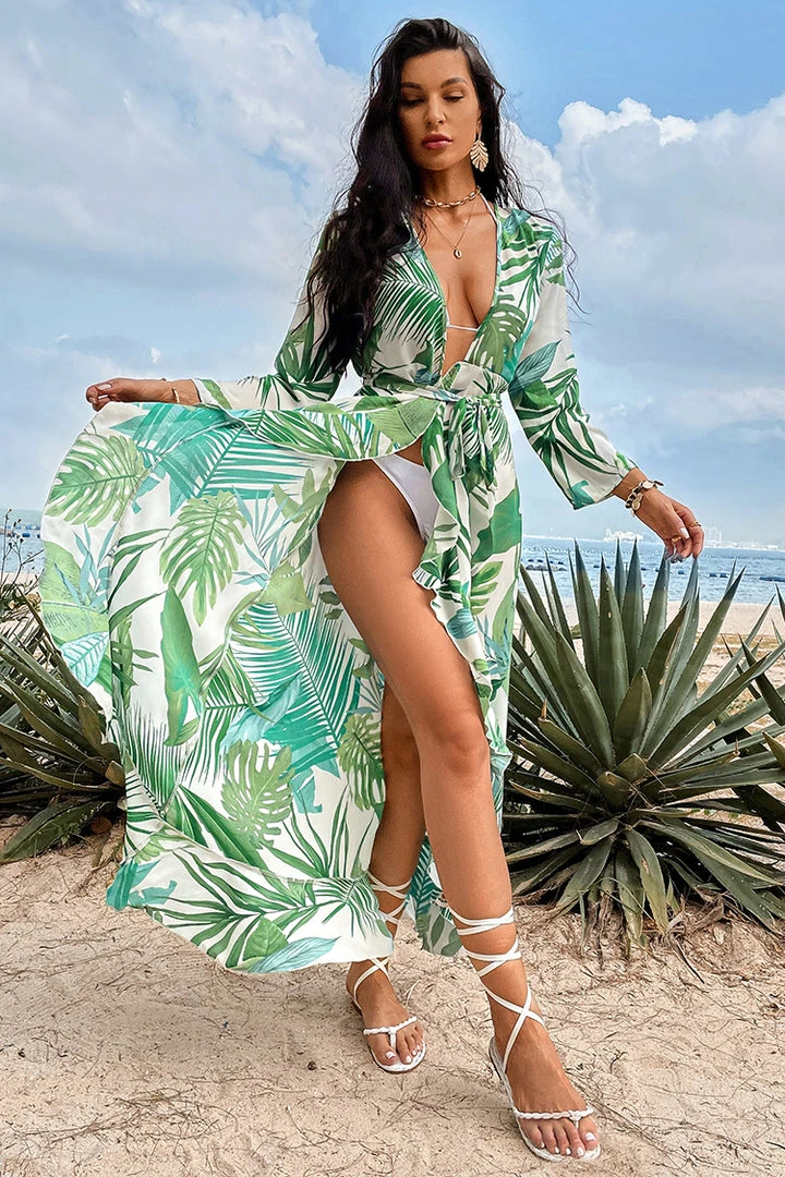 Get beach ready with our Alba V-neck Ruffle Open Front Cover Up. Featuring tropical plants pattern and ruffle. Perfect to wear with your favorite bikini set.