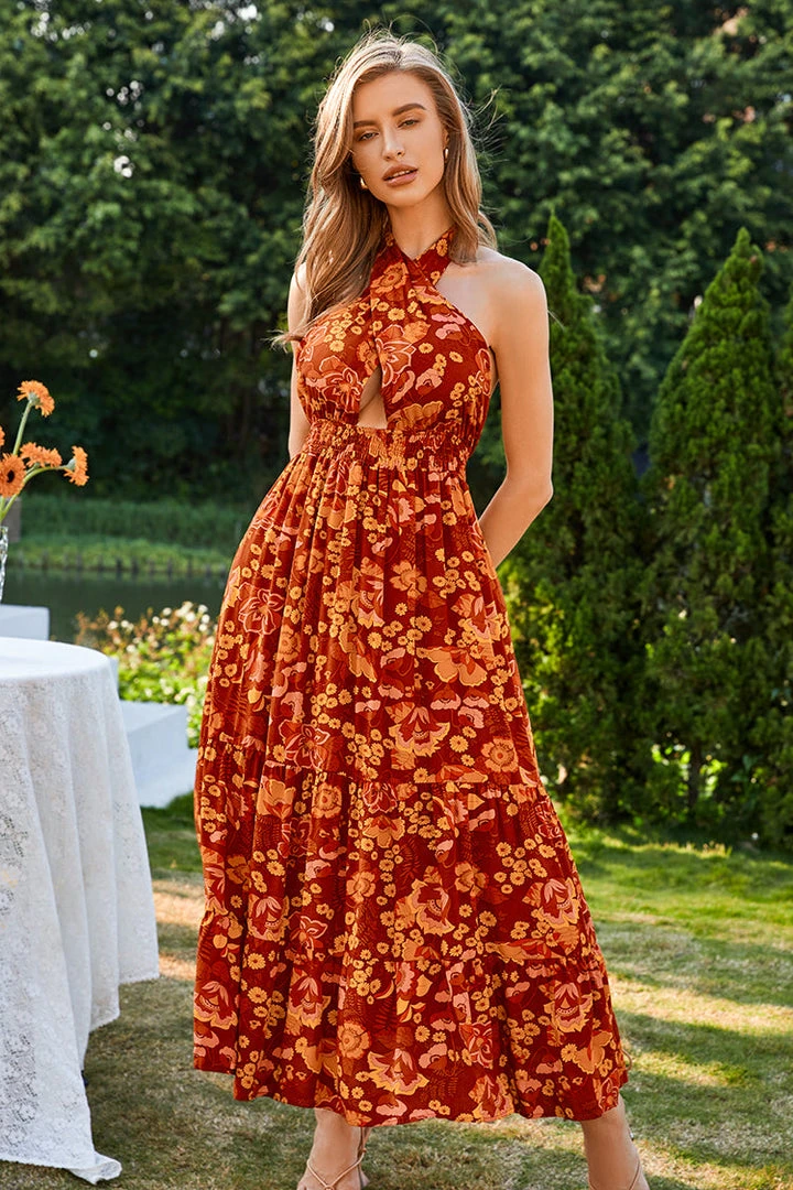 Our Allegra Backless Tie Elastic Waist A-Shape Dress Features a floral print without sleeves. Pair it with heels and a mini bag to complete the look.