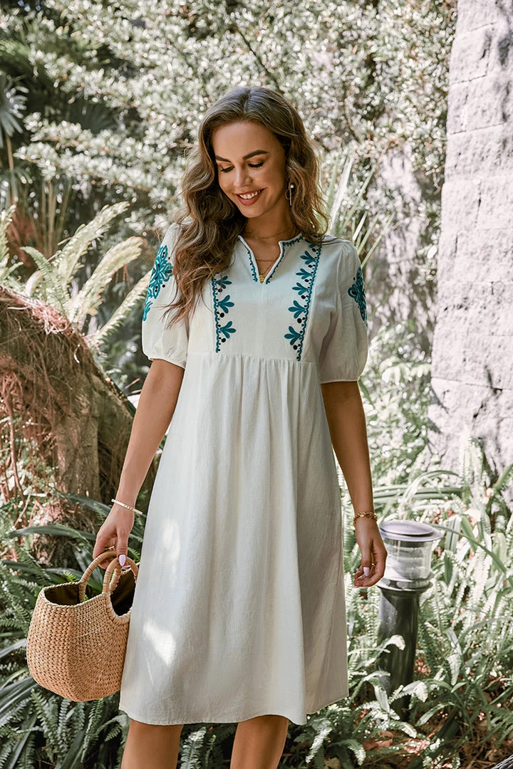 Have fun in the sun with the Althea V-neck Loose Waisted Ruching Dress. This beautiful dress features short sleeves, v-neck and ruching details.