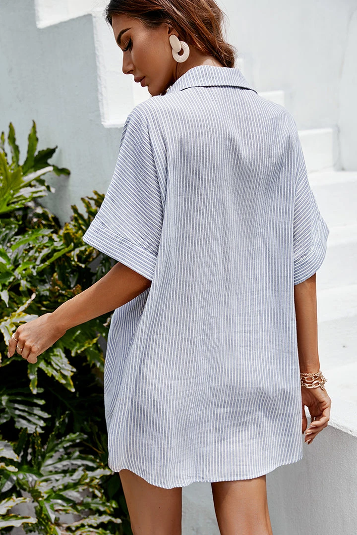 Perfect for everyday commuting, our Analia Dolman Sleeve Stripe Shirt Collar Oversize Dress has a loose, comfortable fit that will keep you cozy throughout the day.