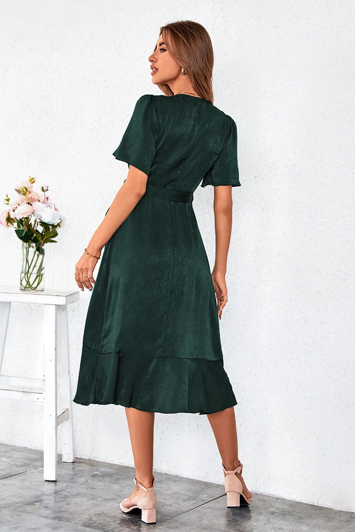 Ensure your look is contemporary and fresh this season with Tie Waist Ruffle Lace Up Wrap Dress. Featuring a V-neck detail and a split front, this dress can easily be dressed up or down.