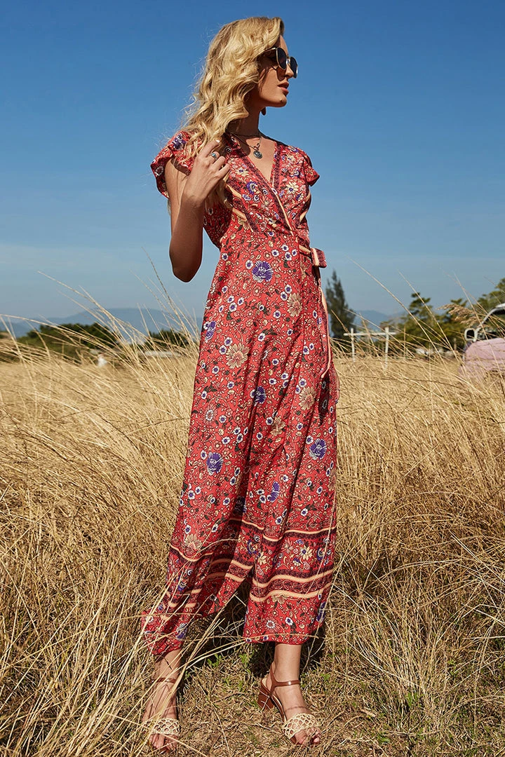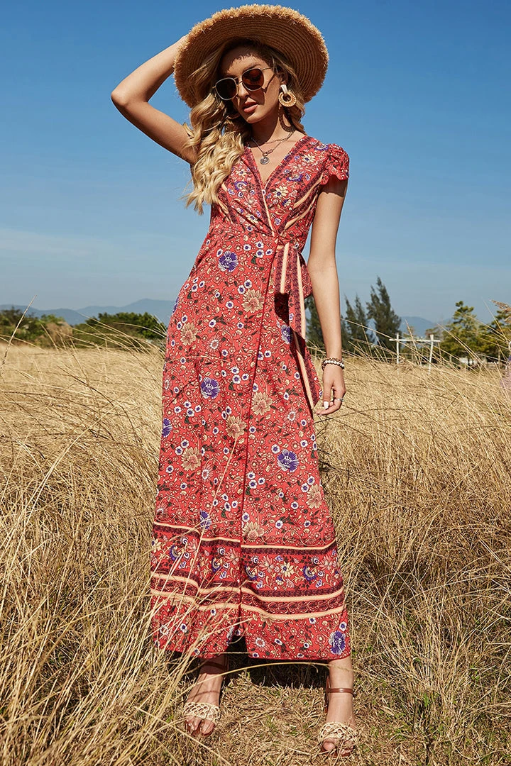 Our V-neck Short Sleeve Tie Waist Wrap Dress will be your new favorite dress. This dress is designed with short sleeve and ethnic print. Wearing it, you will be noble and elegant.