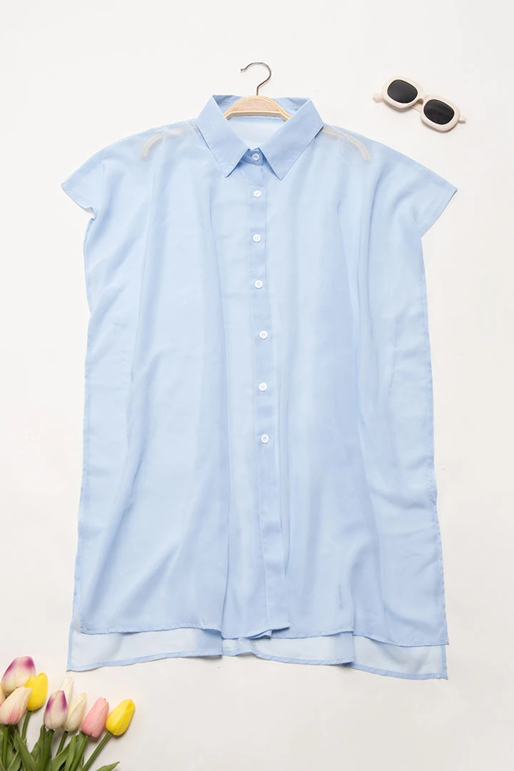 We are obsessed over this Ashtyn Blue Sheer Button-up Shirt Kimono to add to your vacay wardrobe. Featuring blue sheer material with short sleeves and button front detailing.