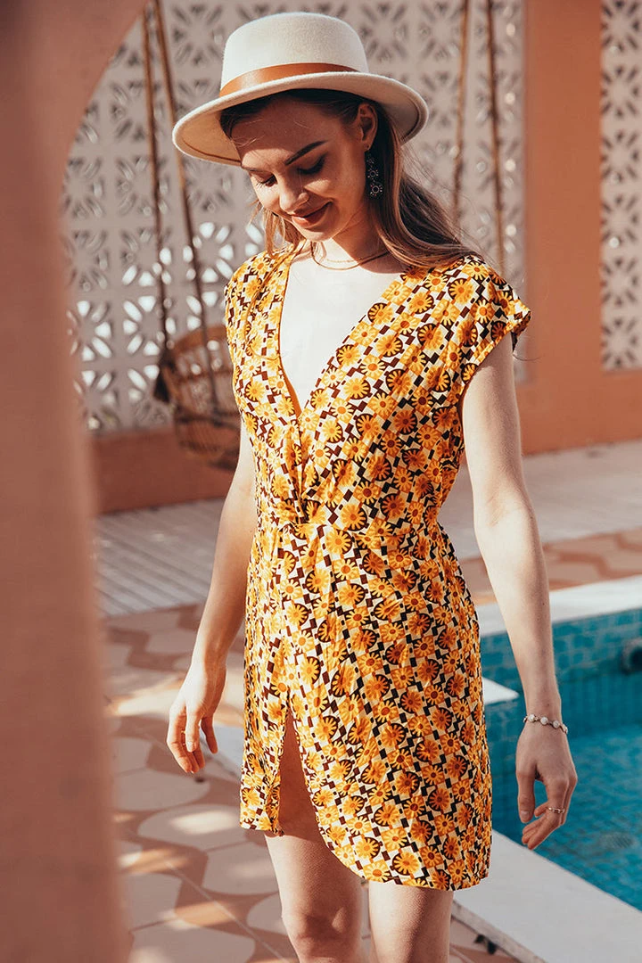 Get ready for your next vacay with Asia V-neck Fitted Waisted A-Shape Dress. This dress features geometric print and v-neck design. Fitted waisted detail for the perfect fit.