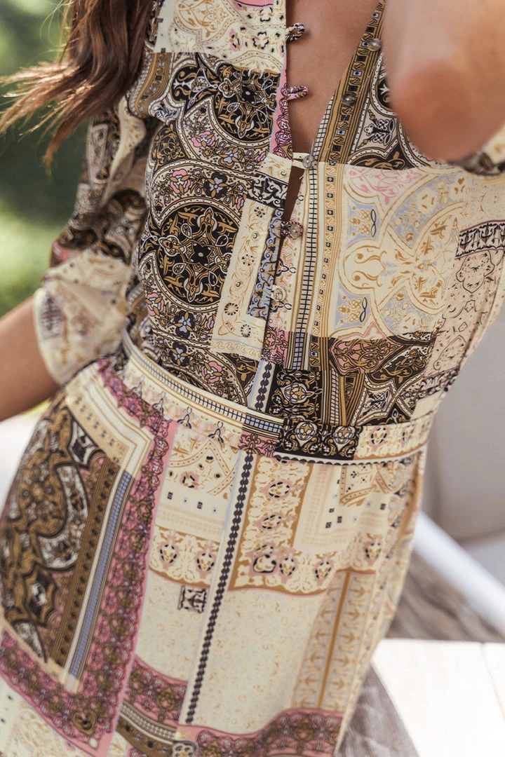 Step out in style with V-neck Raglan Sleeve Fitted Waisted Dress. Featured with v-neck and boho pattern detail. It’s perfect for your next event.