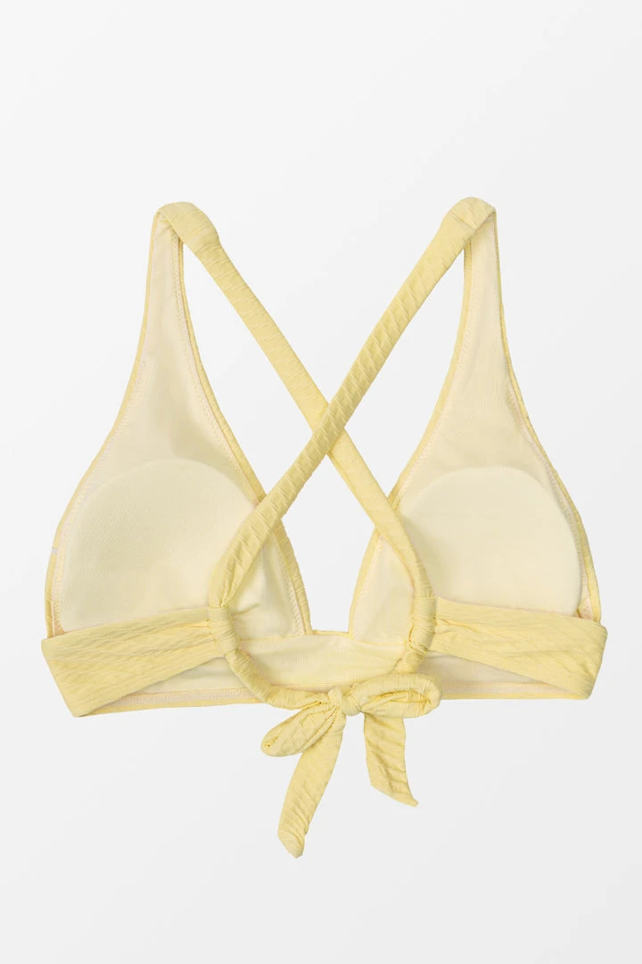 Slay the whole beach in our Kellie Criss Cross Back Tie Bikini Top. Tall triangle with plunge neckline details on the front, criss cross back tie for your comfort. Matching it with our Kellie O-ring Mid Waisted Bikini Bottom.