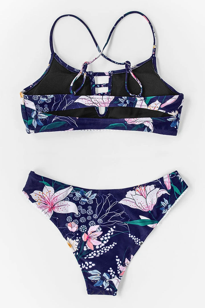 We’re ready for our next adventure when wearing this Navy Floral Cutout Bikini. Strappy details at center front and a flirty cutout. Low-rised bottom with cheeky coverage to show off your curves. .