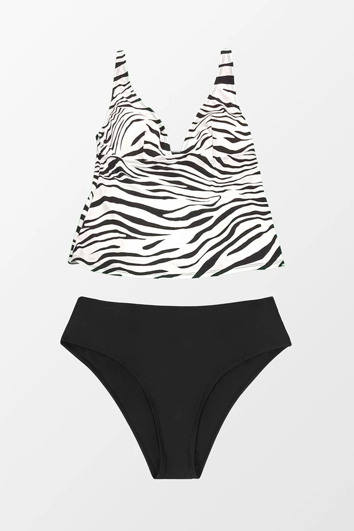 Bring out your inner animal in this swimsuit set featuring a tankini top with an allover zebra striped pattern, plunging V-neckline, and adjustable cami straps, as well as a matching pair of bottoms with a mid-rise waist and modern bum coverage.
