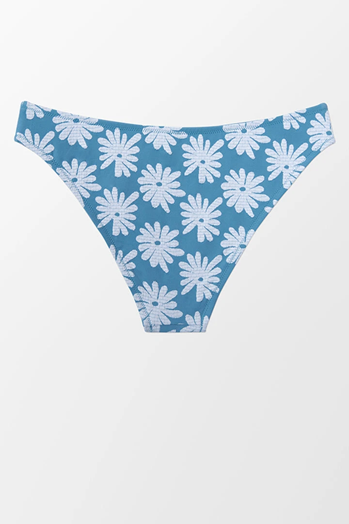 Feel super cute in this Peyton Floral Low Waisted Bikini Bottom. White flower print on blue, fresh and lovely. Pair it with Peyton Hollow Out Criss Cross Back Tie Bikini Top.