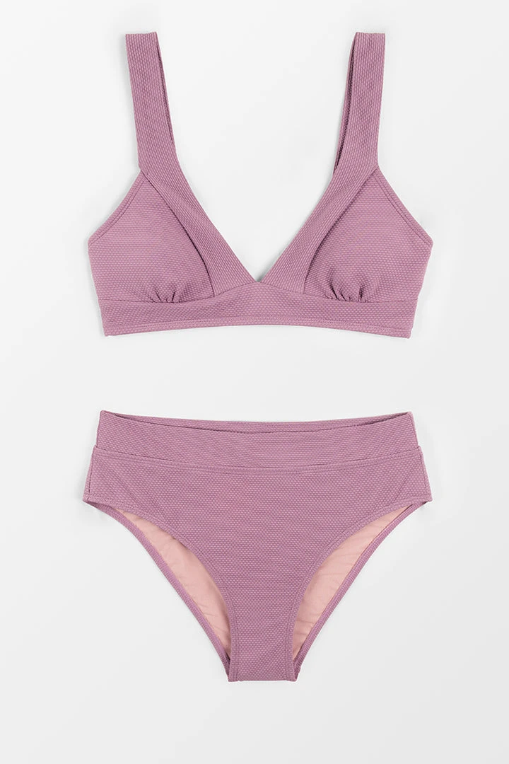 Active two piece bikini swimsuit features a v-neck bikini swim top with wide straps, matching with a pair of high waisted banded bikini bottom.