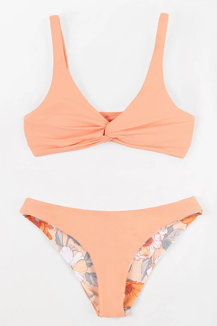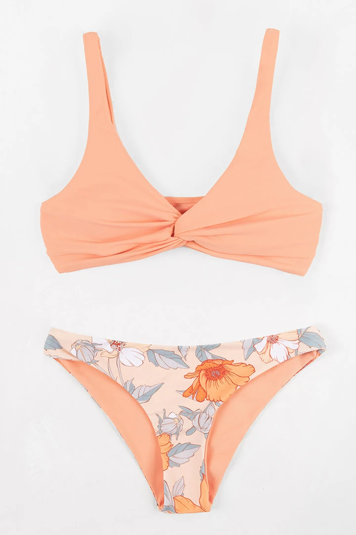 Fashionable, sophisticated, and far from basic, the Romantic Flower Twist-Front Bralette and Hipster Bikini Set will impress the masses at your holiday pool parties. The twist-front style lends a flattering silhouette. The printed bikini bottom has classic coverage.