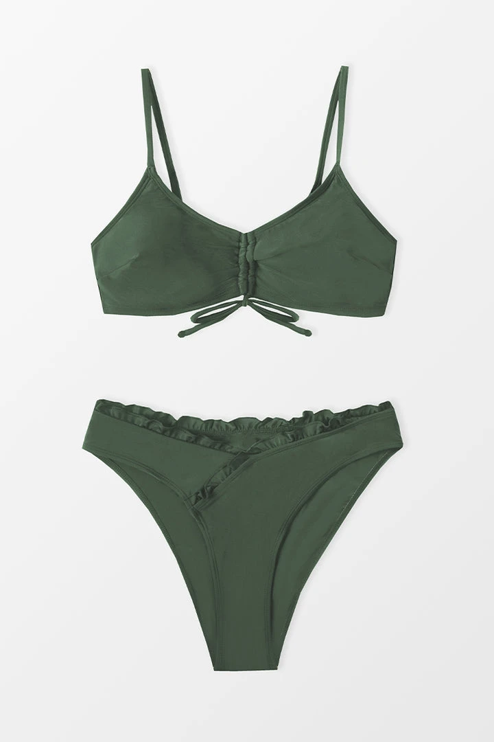 Sexy and chic, this bikini is everything you need for your next girls trip! Featuring a bralette with a scoop neck, ruched drawstring front, and adjustable cami straps, as well as a pair of matching bottoms with a low-rise overlap waist, lettuce-edge trim, and cheeky cut.