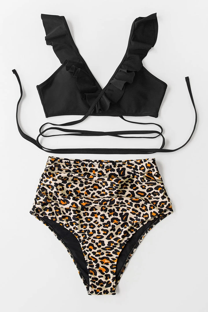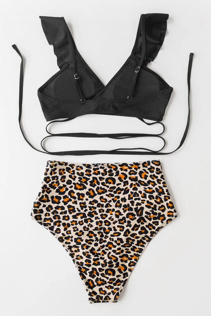Let them hear you roar in our Black and Leopard Falbala Bikini set. The bikini top has a self-ties that wrap around your waist. Ruffle trim at the neckline for added detailing. The high-waist leopard print bikini bottom provides flattering tummy coverage for all-day comfort.