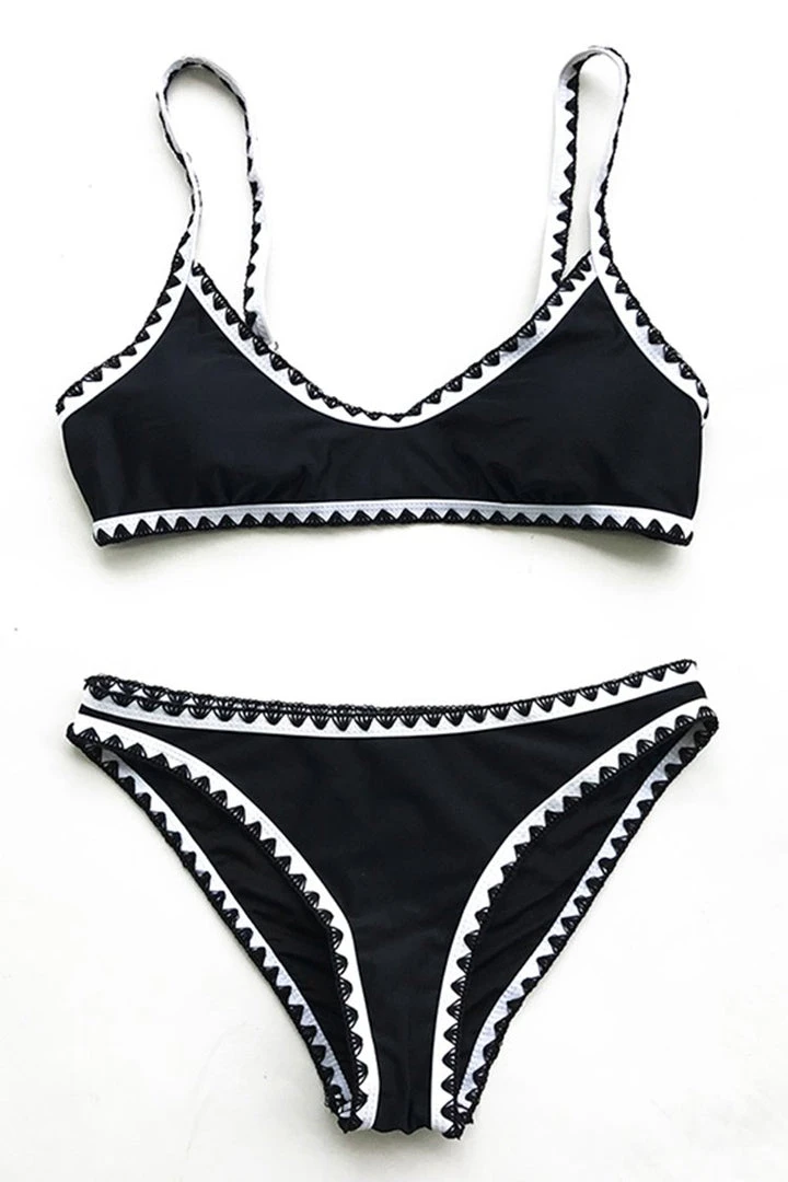 Featuring delicate crochet trim, this bikini set has removable padded cups and adjustable shoulder straps for an easy fit.
