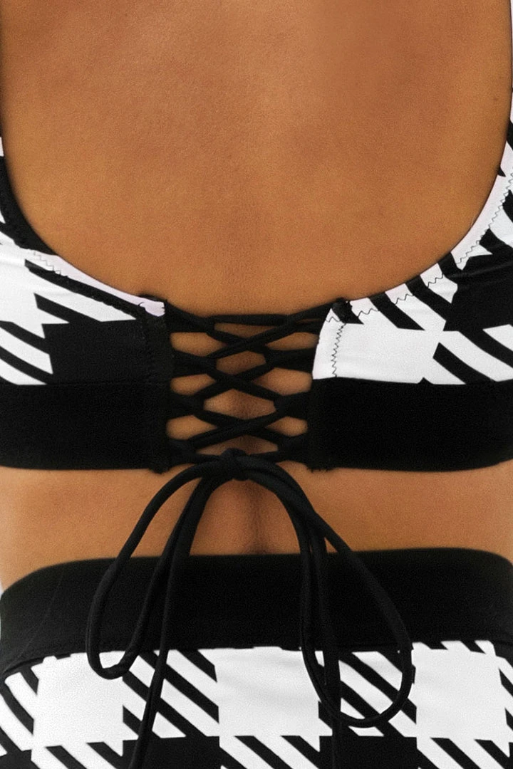 Sporty and flirty! Our Black and White Plaid High Waisted Bikini set features wide shoulder straps and a lace-up back. The high-waisted bottom for the perfect tummy coverage.