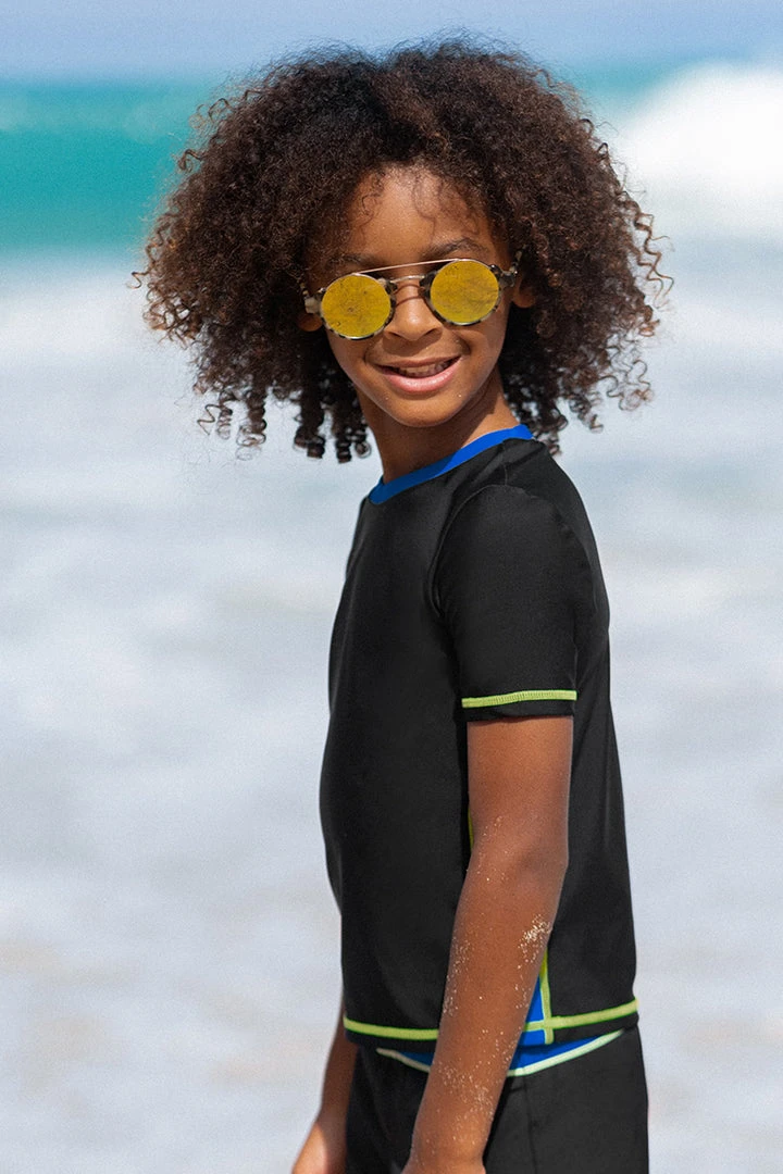 Introduce him to the cool club with this colorblock swim tee. A pop of color stitching and contrasting blue means he’ll never get lost in a crowd.