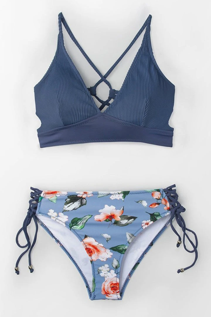 Freshen up your beachside look with the Blue And Floral Lace-Up Bikini. An adjustable lace-up back adds just enough drama.The floral bikini bottom against a blue background makes for a simply sweet look, and lace-up sides let you find a sure fit.