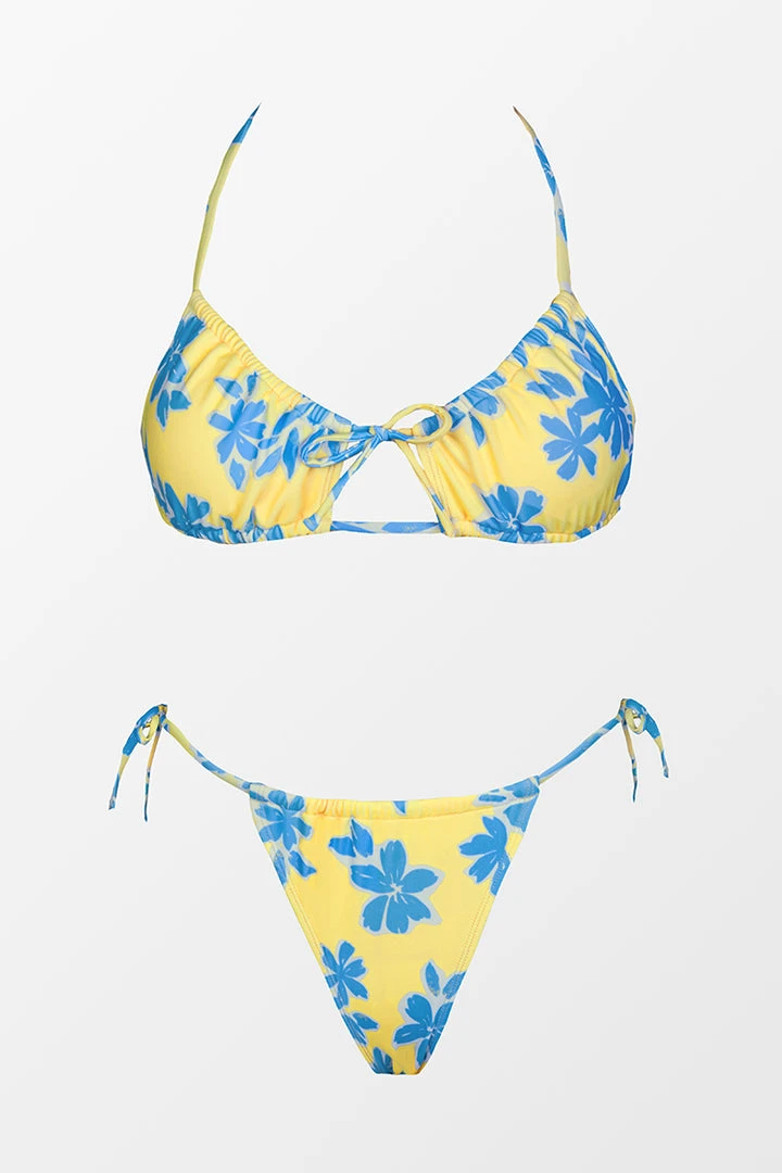 Make a splash in these pretty blooms made for summer pool parties. The bralette bikini top features an adjustable tie front and cutout for extra sexy vibes. The ultra cheeky bikini bottom with adjustable side ties offers barely-there appeal.