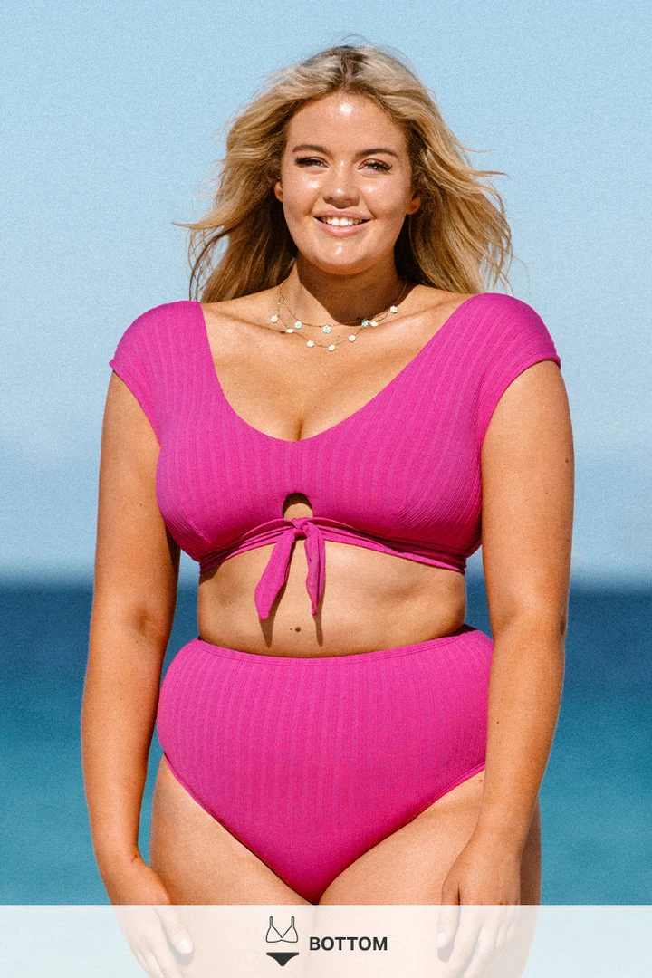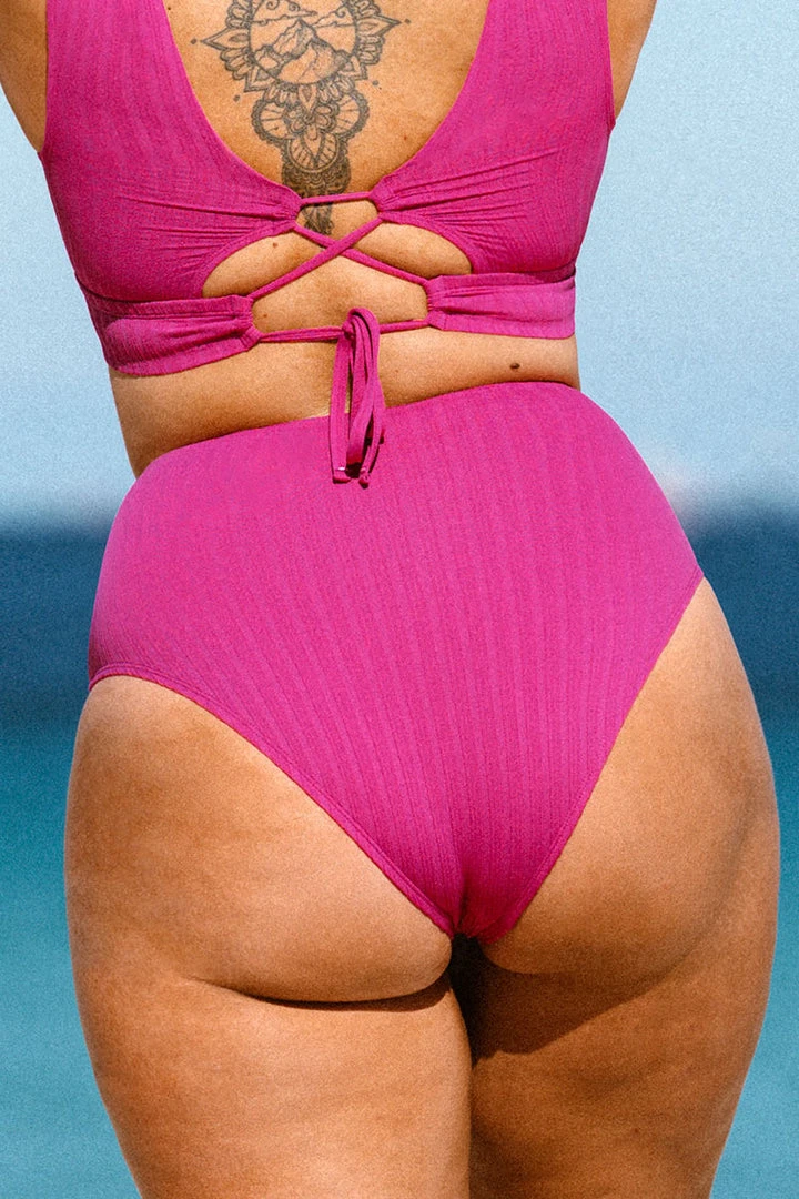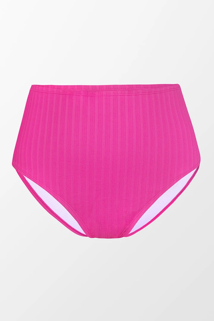 Cut from a stretchy ribbed fabric in a pretty magenta color, the classic bikini bottom has a high waist silhouette that provides a sleek, slimming look.
