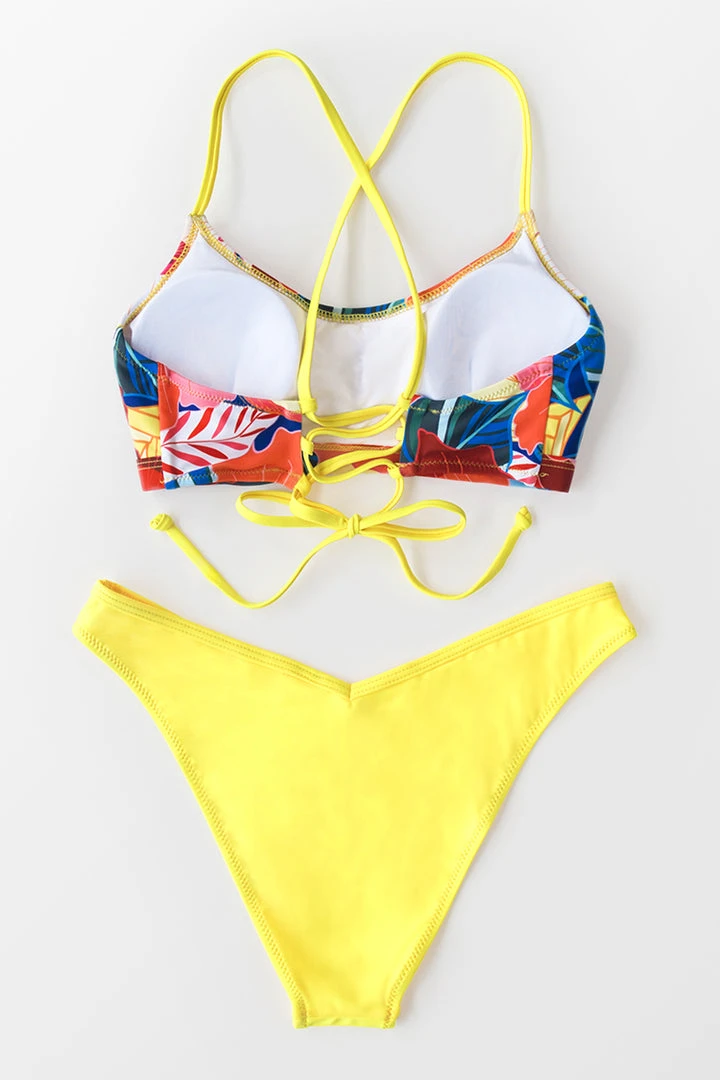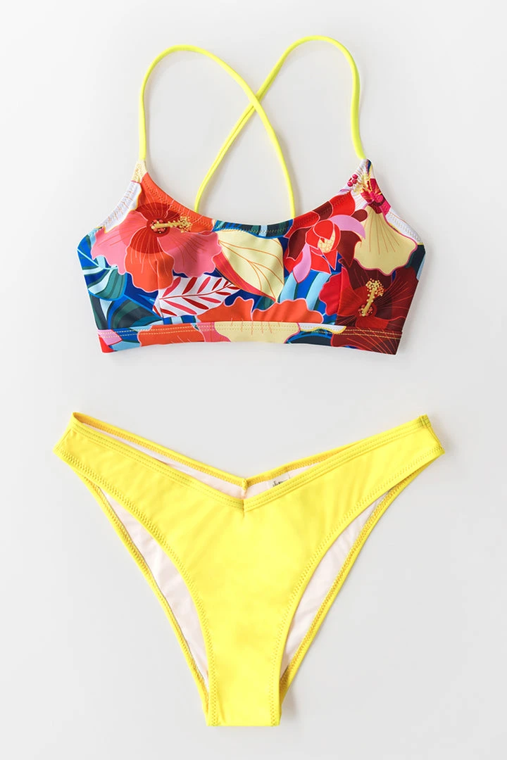 Stand out in our Bright Floral Print Bikini set. This set features a bright floral print bikini top with criss back straps that’s paired with a yellow solid bottom. The matching bikini bottom has a low rise fit.