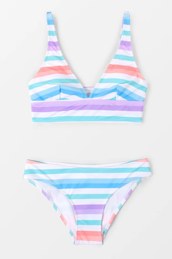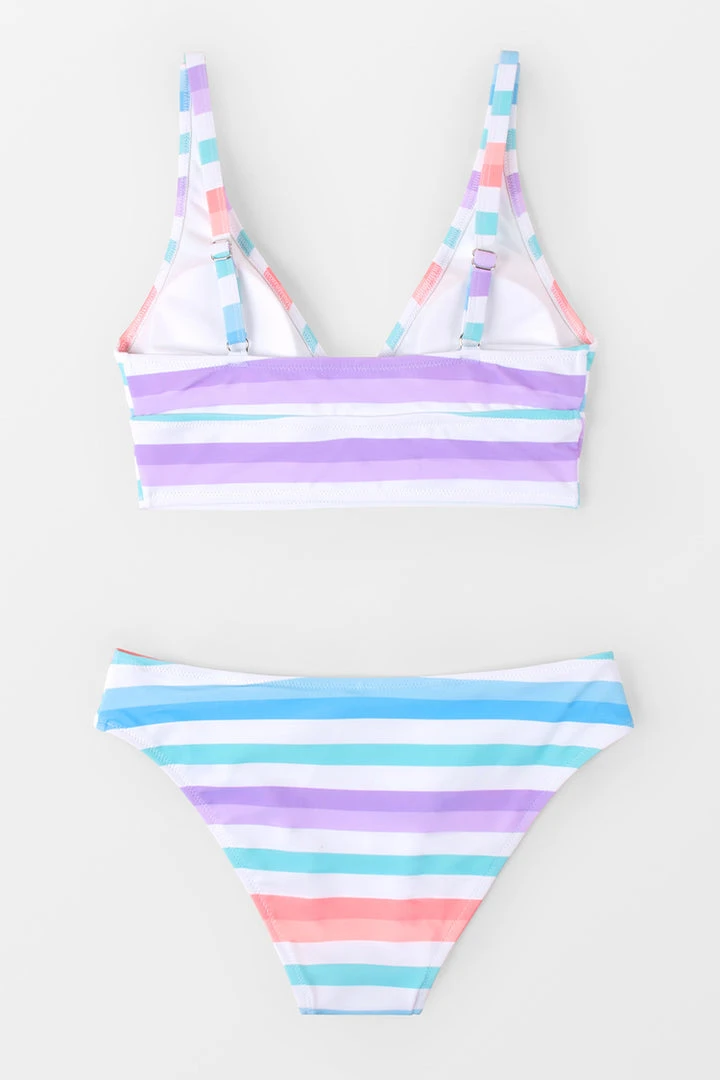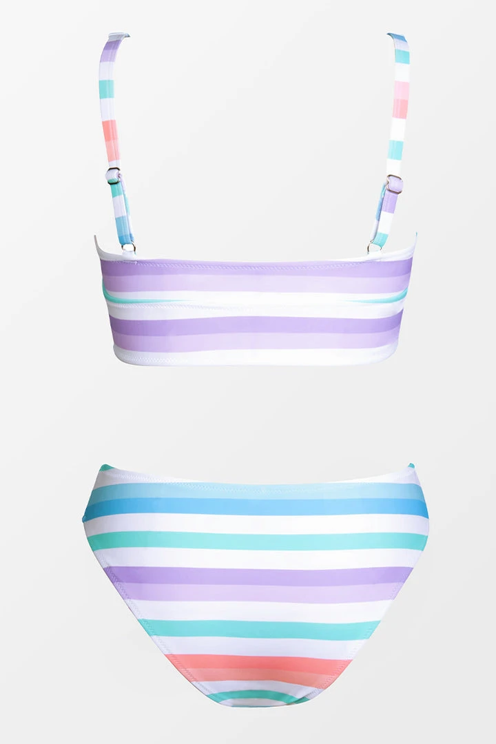 A classic silhouette with a modern twist, this swimsuit boasts a vibrant striped pattern that captivates the eye and adjustable straps for added support. The hipster bikini bottom has classic bum coverage.