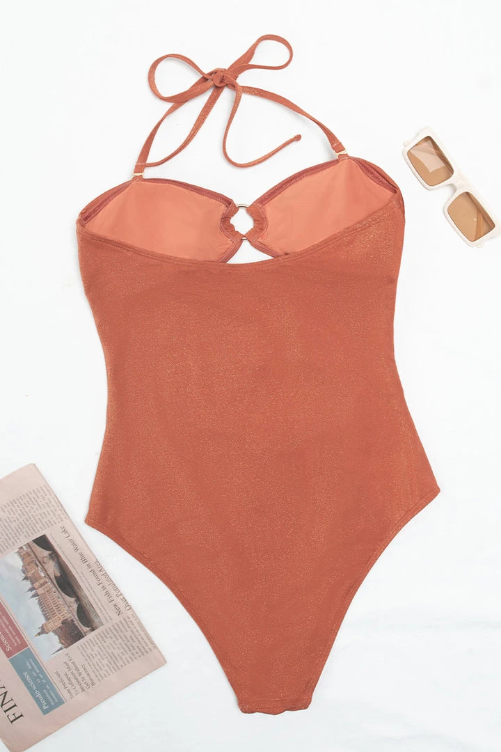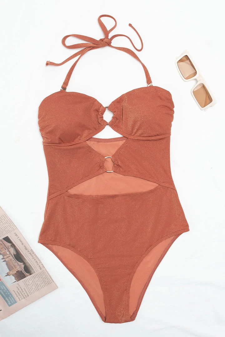 Make a bold statement with our Brook O-ring Halter Cut-out One Piece Swimsuit. This flirty one-piece features halter design with o-ring and cut-out front. It’s the perfect one piece for the summer.