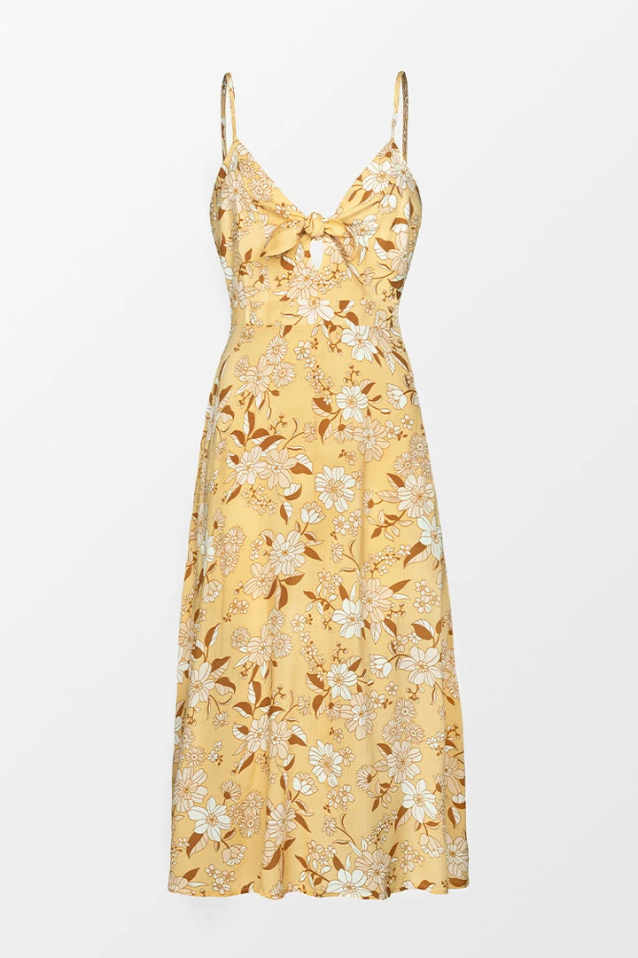 Nothing says Summer like Bryanna Floral Cut Out Tie Dress. A classic floral print in white and brown details the yellow pair to elevate the look! Featuring zip on the back and adjustable straps. Cut out and bow tie detail add a hint of cuteness.