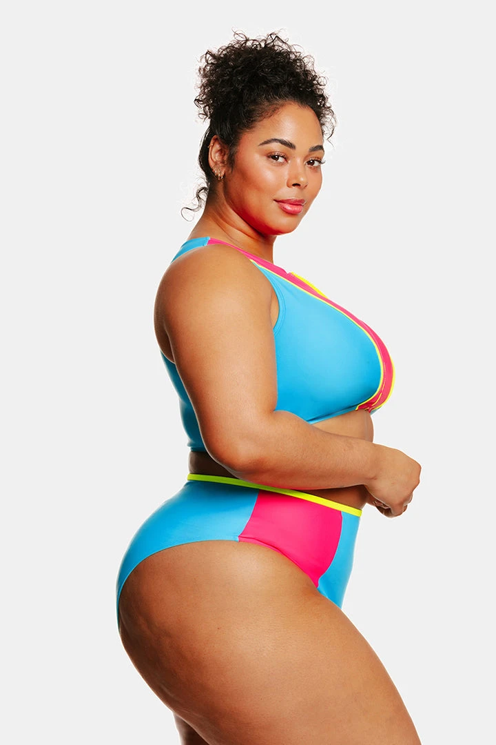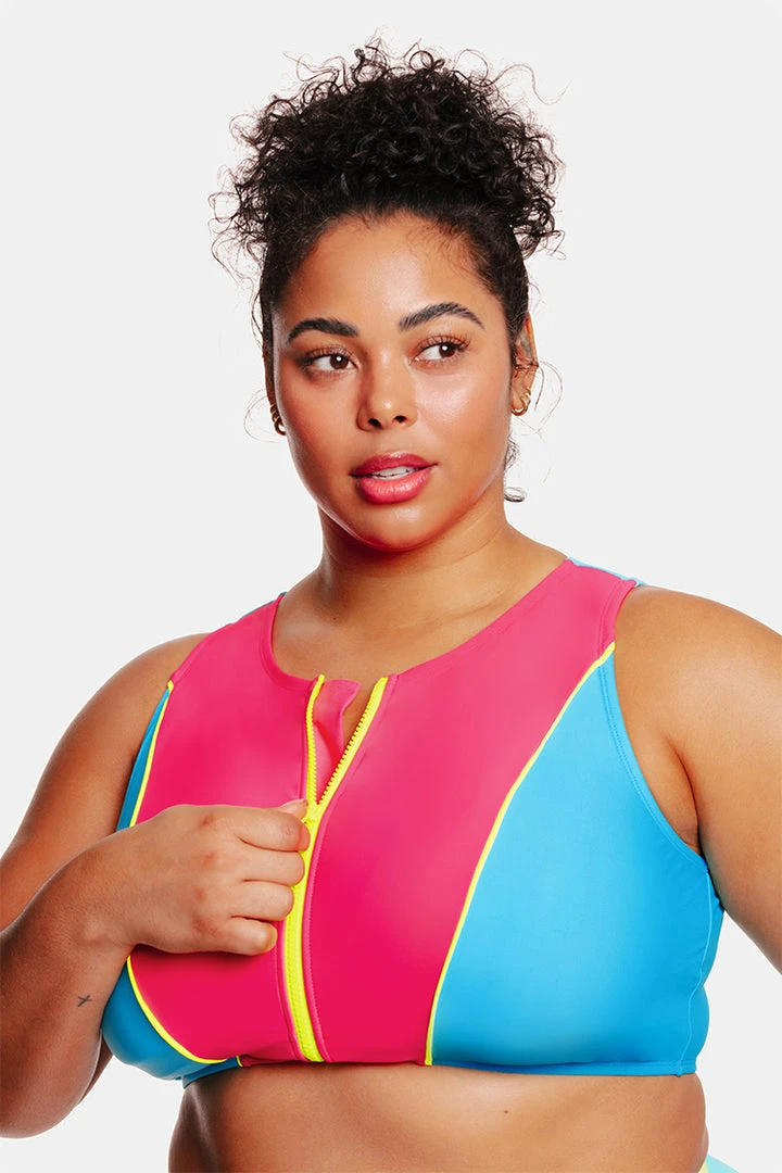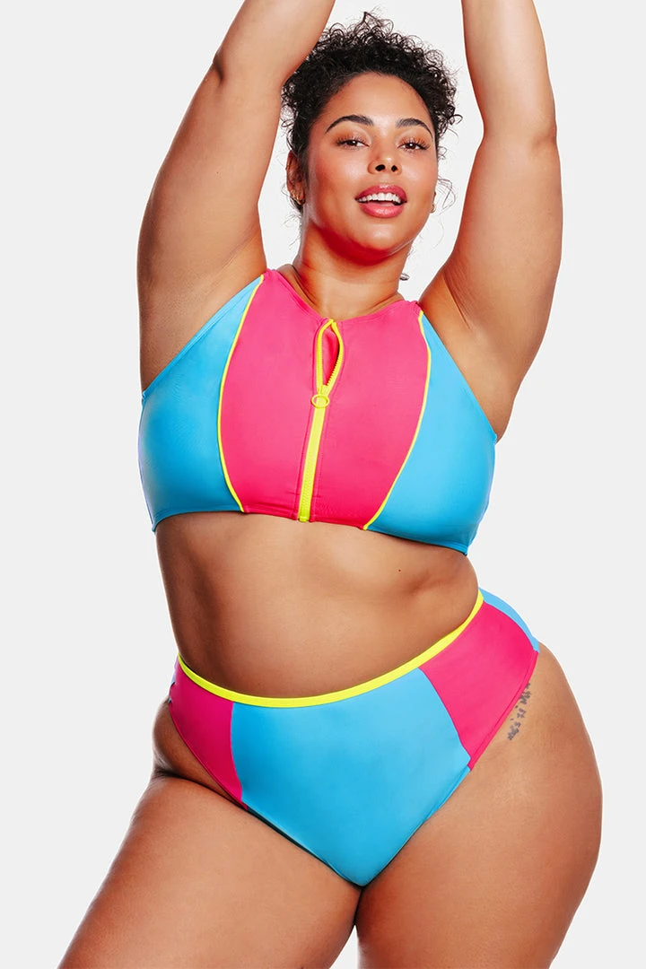 There’s never a dull moment with this bright bikini set! The tankini crop top offers a zip-up front for high support, while the matching pair of bottoms provides a cheeky high-leg cut and high-rise waist for your comfort.