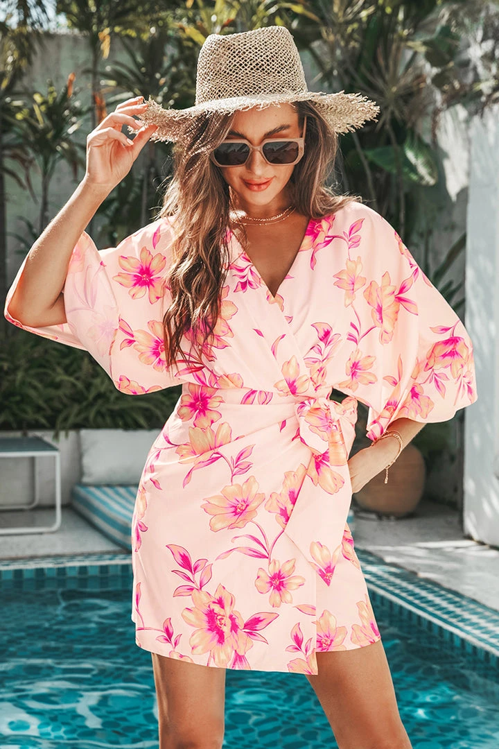 Your next summer vacation is set in this Dolman Sleeve Floral Cover-up Dress. It’s printed with vivid florals and features dolman sleeves, a V neckline, waist tie detail.
