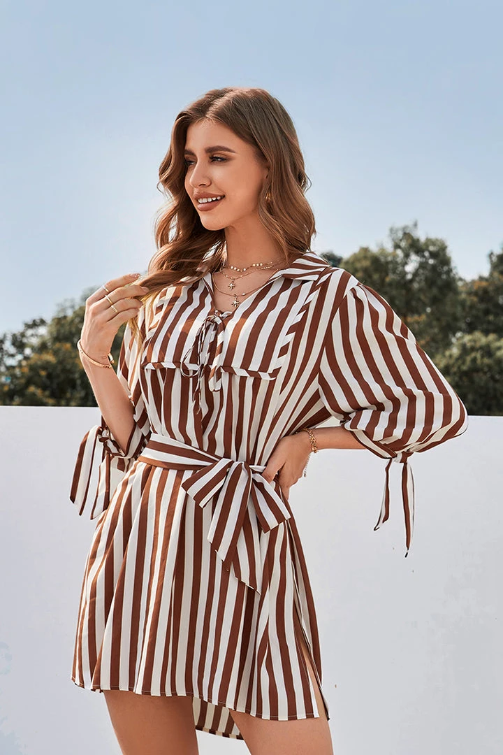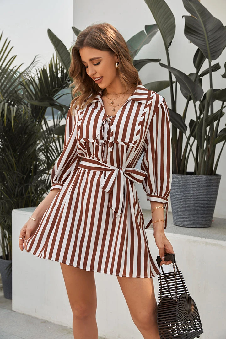 Step out in style with Chantal Shirt Collar Stripe Short Shift Dress. It adopts the design of shirt collar. Wearing it, you will look very energetic. You must give others an impression of a smart and capable urban office lady.