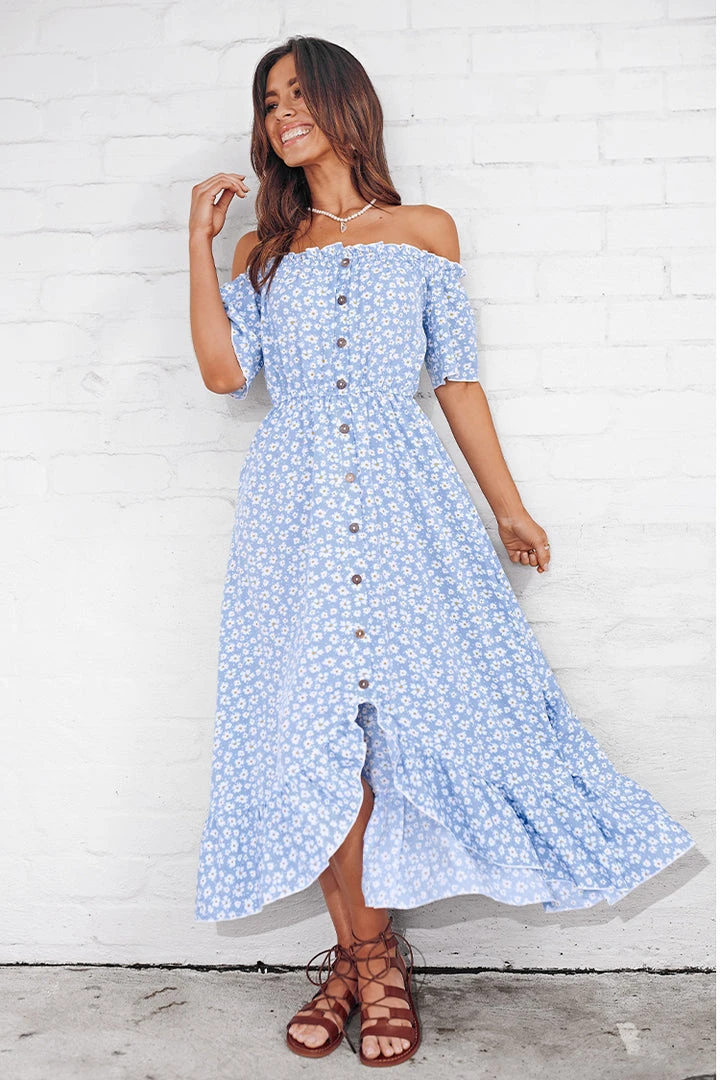This Off-shoulder Ruffle Ruching A-shape Dress is perfect for spicing up your new season wardrobe. This pretty dress features an all over floral print, a ruffled off-the-shoulder styling.
