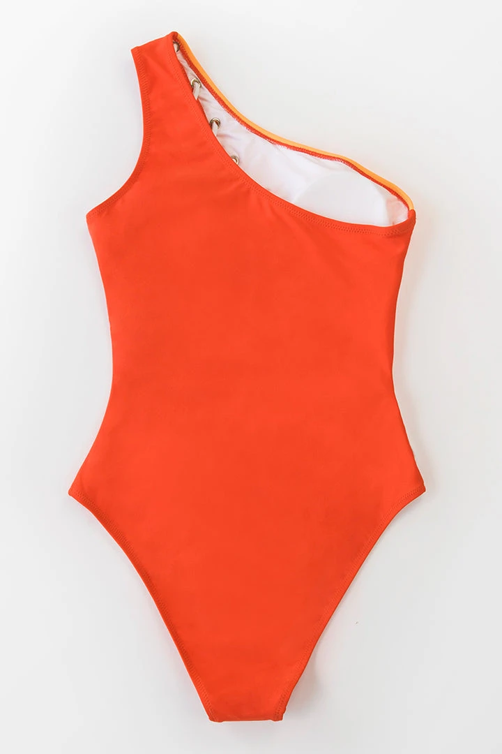 Colorful and joyful, this Colorblock One Shoulder Lace Up One-Piece Swimsuit will have you standing out from the crowd! Features one shoulder design and cute lace up detailing at front.