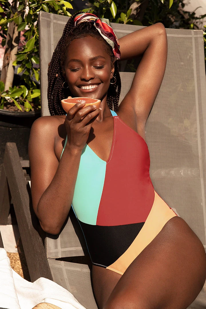 Colorful and joyful, this Colorblocked V-Neck One Piece Swimsuit will definitly have you standing out from the beach crowd! Features V-neck design and criss-crossed back straps.