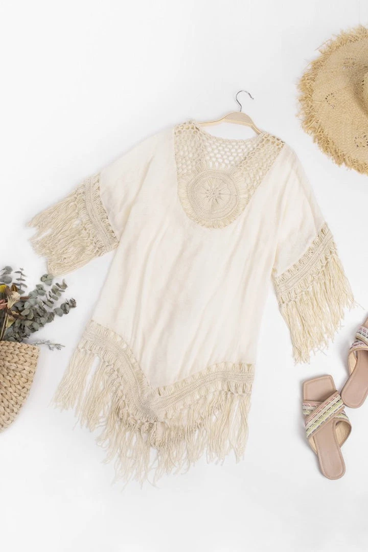 It feels good when you’re wearing Anne Crochet Fringe Hem Kimono. Featuring contrast crochet and fringe hem, style with a cute bikini for a poolside look that won’t go unnoticed.