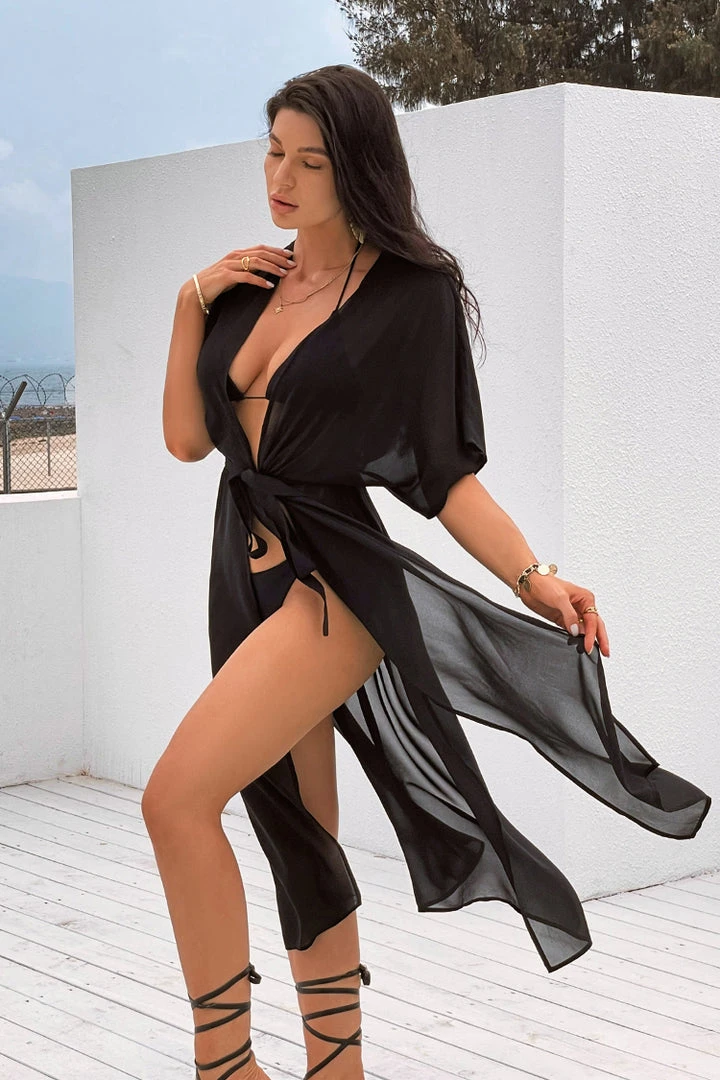 We are obsessed over this Demetria Short Sleeve Tie Waist Tea Length Kimono to add to your vacay wardrobe. Featuring drop shoulder sleeve and tie waist detailing.