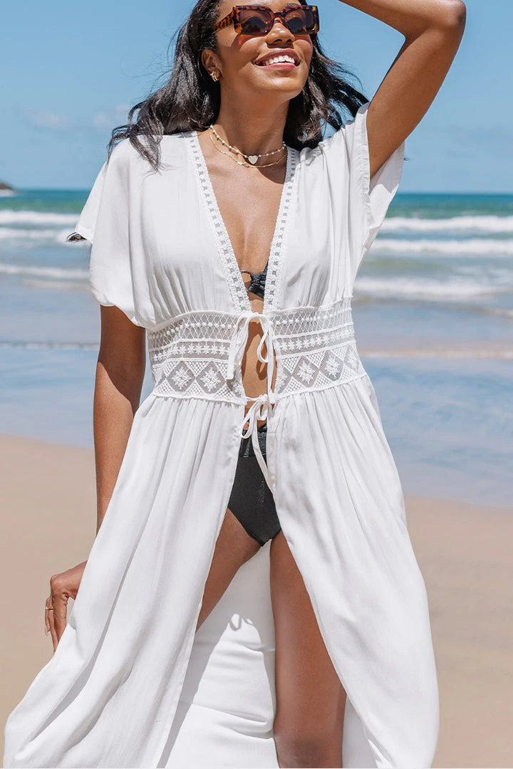 Your vacay look is not complete without this Drina Plunge Open Front Tie Cover Up.This eye-catching cover up features cut out detailing. Wear over your fave bikini set for a style we’re obsessing over.