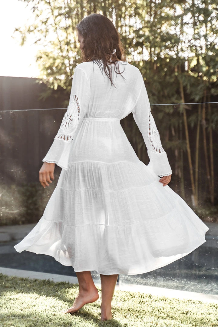 Get beach ready with our V-neck Long Sleeve Tie Waist Cover Up. Featuring lace trims and v-neck. Perfect to wear with your favorite bikini.