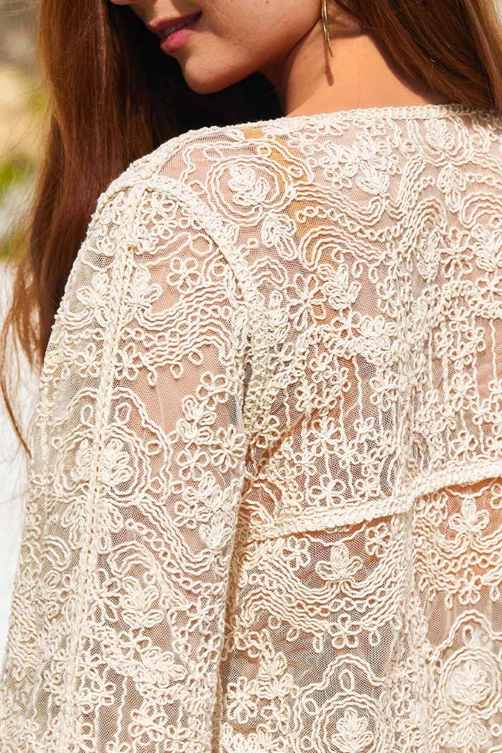 Get ready to have all eyes on our Maci Embroidery Button Front Kimono. Featuring a soft embroidery material and button front. A perfect companion to wear with your favorite bathing suits!