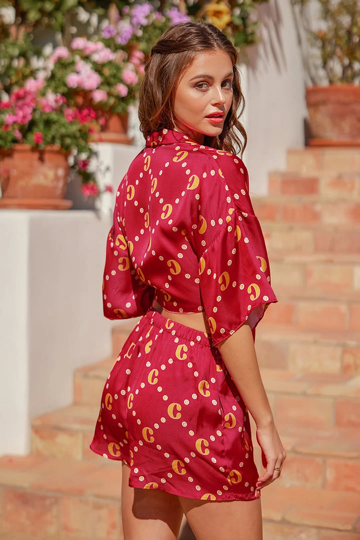 Elevate your beach look with our Vestrahorn Red Cover Up Set. Featuring geometric print and tie waist design. The perfect loose fit for a vacay ready look.