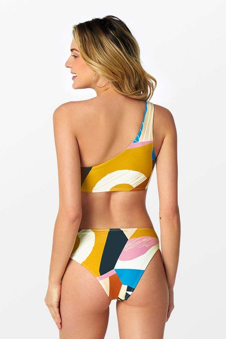 Chase the sun in our Dana Abstract Print One Shoulder Bikini set. This swimsuit features a pretty abstract artwork print with a one shoulder silhouette. The matching mid waisted bikini bottom has a o-ring detailing at side with moderate cheeky coverage.