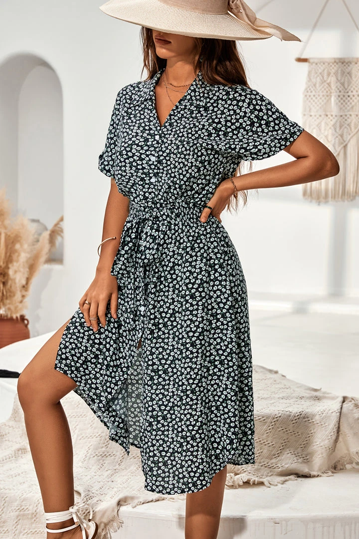 This Deb Button Smocking Shirt Collar Dress is friendly to all body types and can be worn without restraint. The ditsy pattern is very age-reducing.