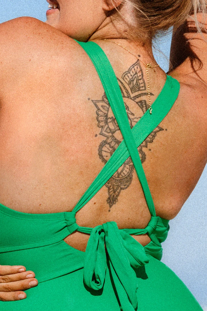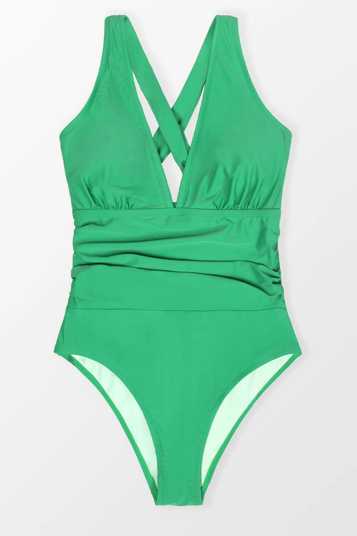 The Dessert & Daiquiris Shirred Halter Plus Size One Piece Swimsuit will turn some heads at the beachside. The vintage-inspired one piece features halter ties, adjustable cross back straps, and a plunging neckline. Crafted in a lush green that’s generously shirred in the center to flatter your feminine form.