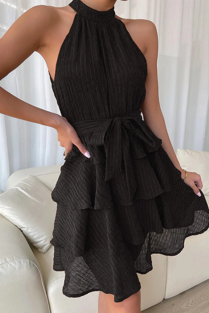 Feel super cute in our Round Neck Sleeveless Ruffle A-Shape Dress. Features with round neckline and fit waist. Dress it up by wear with your favorite heels and hoop earrings.