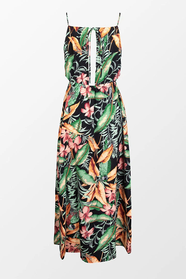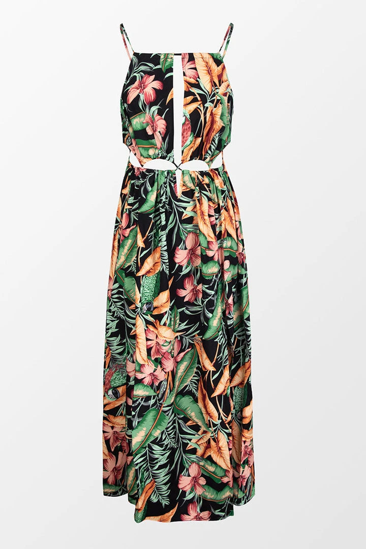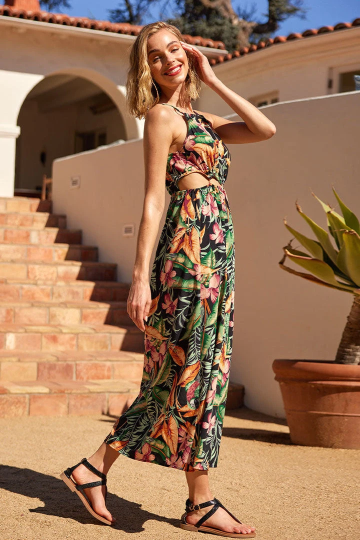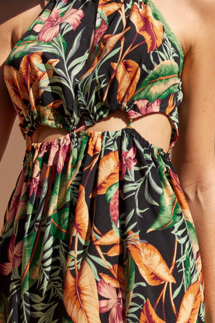 Add this dress to your summer wardrobe. This Asia Halter Neck Fitted Waisted Tropical Plants Dress features pretty tropical plants prints.
