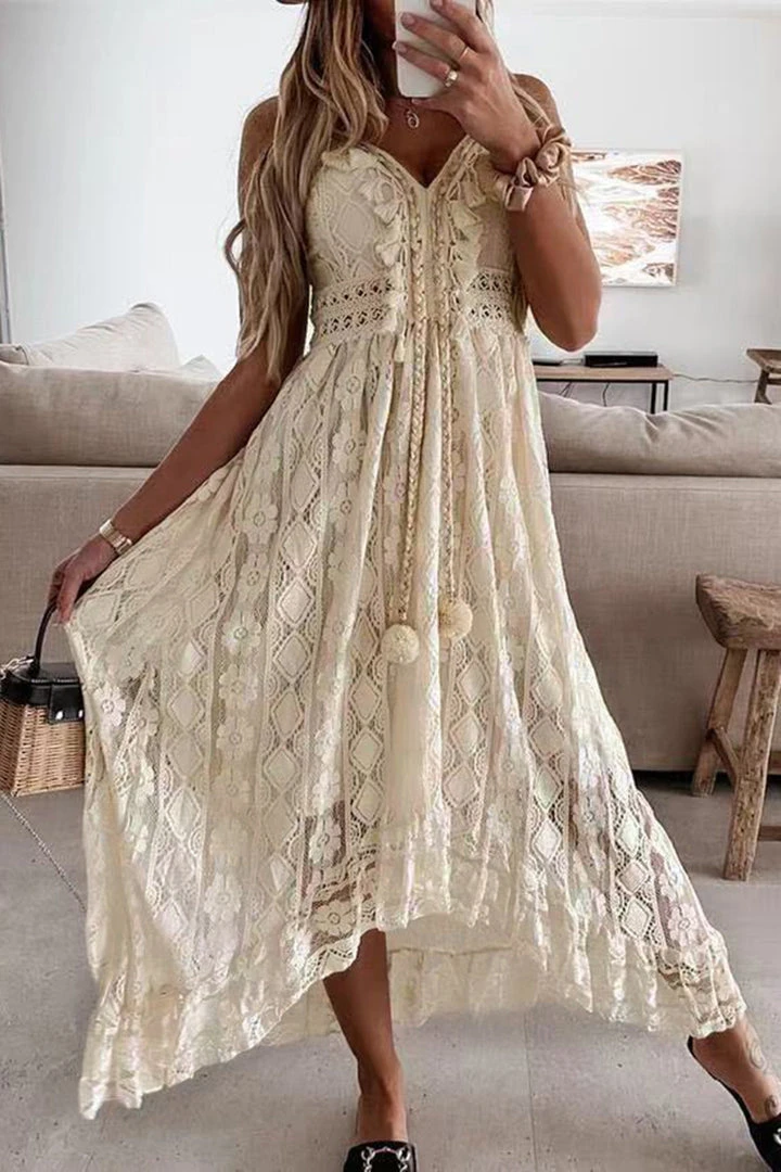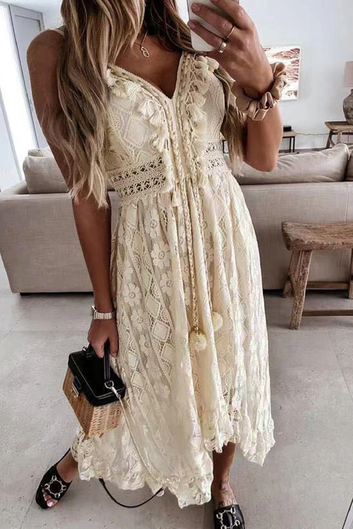 You’ll look beyond darling in this Sleeveless V-neck Tassel Ruching Dress. Featuring a V-neckline, tassel and smocking design, ruffle detailing. Team it with some strappy heels and a mini bag to finish the look.