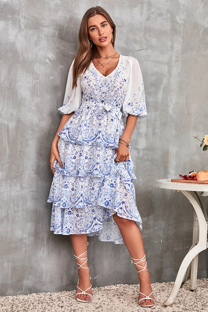 This Geneva Floral Bubble Sleeve Tie Waist A-Shape Dress will make the sweetest statement. Features bubble sleeves and a V neckline.